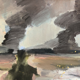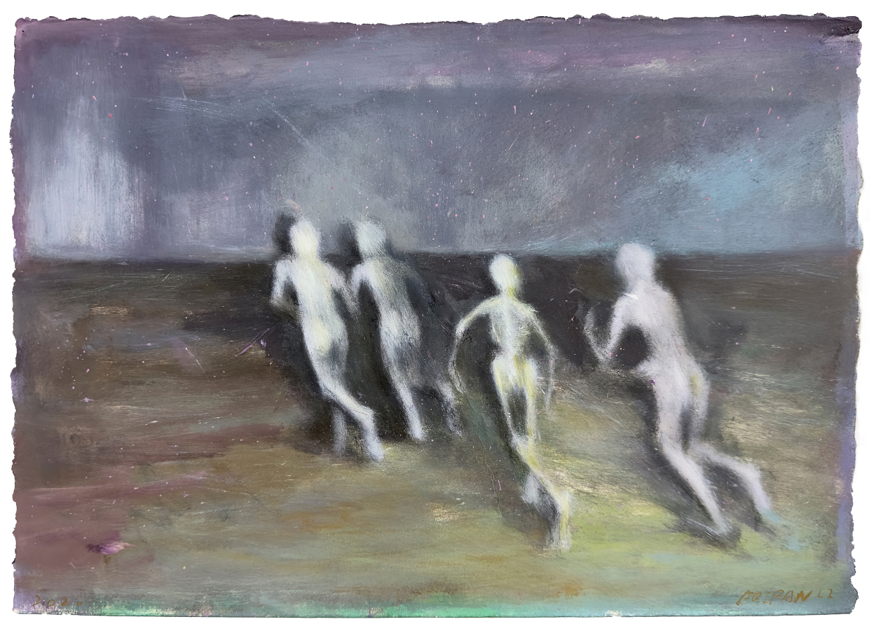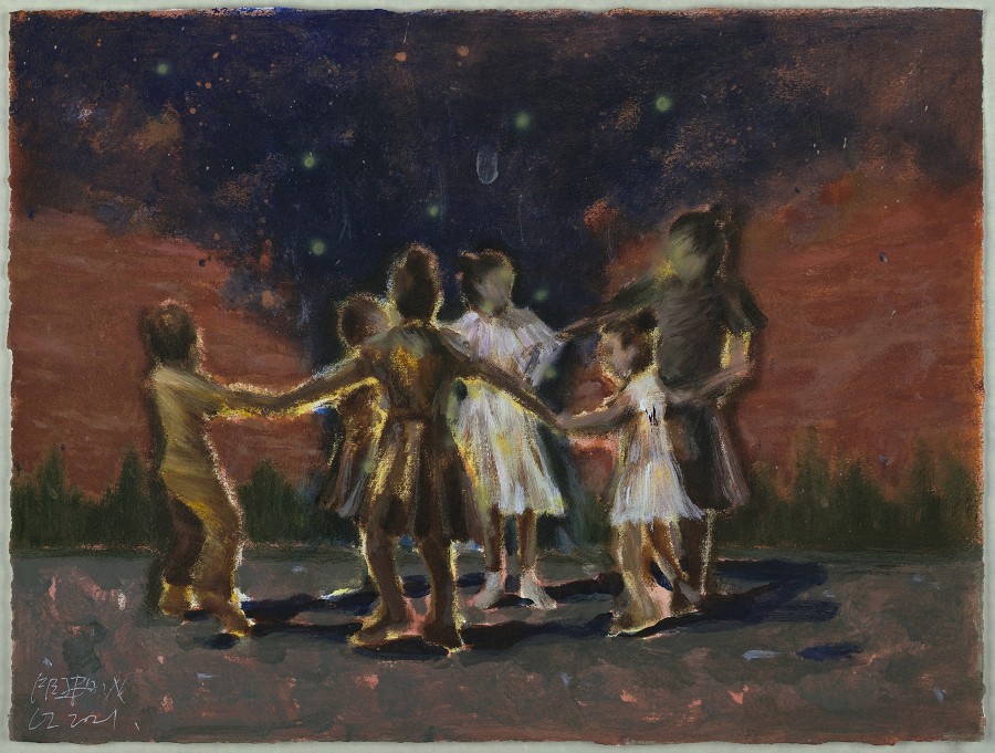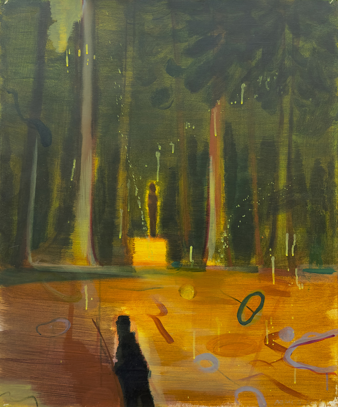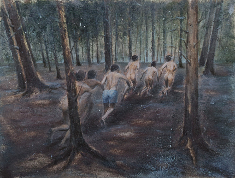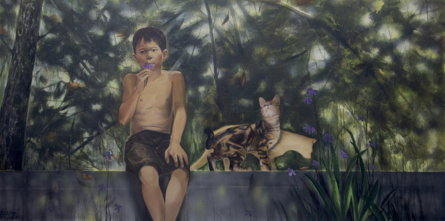 在作品中我更加关注于画面本身的状态呈现。荒诞而又真实的状态,诙谐的趣味性与创作笔触的偶然痕迹是我创作的注重点或者说是感兴趣因素。以丙烯和油彩为创作媒介,用不确定的事物和不确定的场景建立虚构荒诞的“风景”,独特的肌理给予创作画面更加强烈的视觉效果,同时带有偶然的痕迹。我在作品中将顽皮少年的形象置于荒诞的场景之中,少年形象是自身的缩影,朦胧的场景来源于童年的印象记忆之中。这种景观面貌在呈现荒诞与诙谐的同时表现我的个体生活现状。